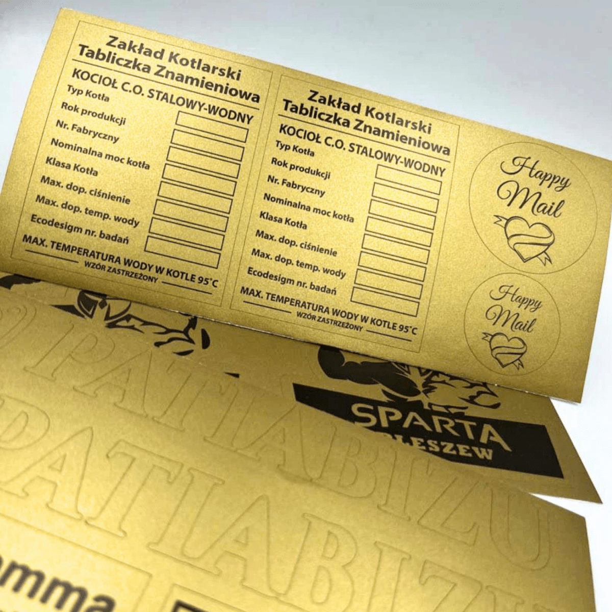 Naklejki na złotej folii idealnie sprawdzą się jako logotypy. Możesz wybrać dowolny kształt, a my zadbamy o precyzyjne wycięcie etykiety. Dzięki zastosowaniu nowoczesnej technologii druku możemy odwzorować praktycznie wszystkie kolory przesłanej grafiki.